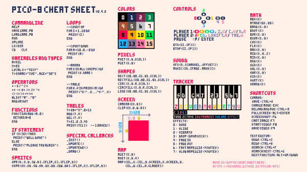 The programming language Lua offers the possibility of quickly creating software and one of the first objectives will be to imagine the final rendering. All the game documentation is contained in a text file and a quick overview is provided on the "Pico-8 Cheat Sheet", like a memo.